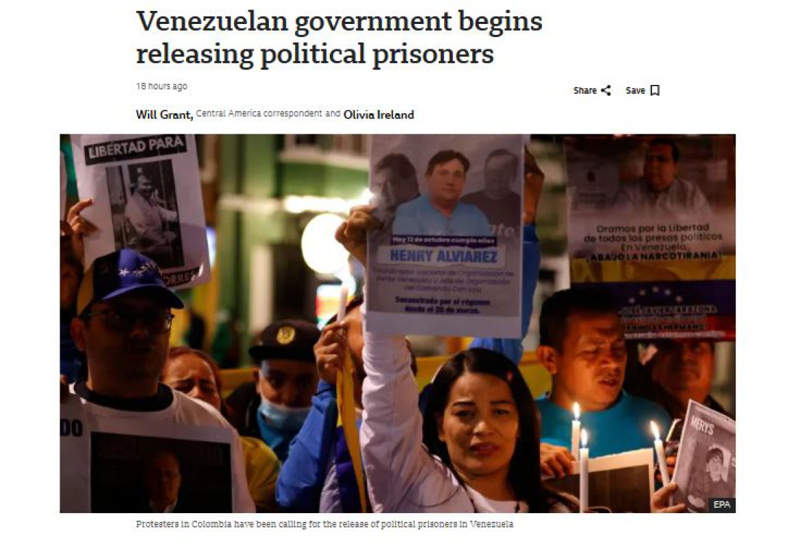 ဗင္နီဇြဲလားအစိုးရသည္ ႏိုင္ငံေရးအက်ဥ္းသားမ်ားကို ဇန္နဝါရီ ၉ ရက္တြင္ စတင္ျပန္လႊတ္ေပးခဲ့ေၾကာင္း သိရသည္။ ႏိုင္ငံေရးအက်ဥ္းသားမ်ားကို ျပန္လႊတ္ေပးမႈသည္ ဗင္နီဇြဲလားအစိုးရကို အေမရိကန္အစိုးရက ကာလ အတန္ၾကာေတာင္းဆိုေနသည့္အခ်က္မ်ားထဲတြင္ ပါဝင္ေၾကာင္း သိရသည္။