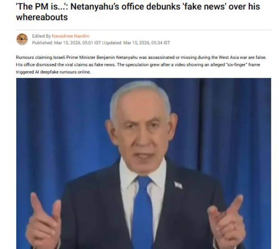 ပြီးခဲ့တဲ့ မတ်လ ၁၃ ရက်က ထွက်လာတဲ့ ဝန်ကြီးချုပ်နေတန်ရာဟုရဲ့ ရုပ်သံမိန်းခွန်းထဲမှာ ညာဖက်လက်က ၆ ချောင်းရှိနေပြီး အဲဒီရုပ်သံဖိုင်ထဲက ဝန်ကြီးချုပ်ဟာ အစစ်မှန် မဟုတ်ဘဲ AI နဲ့ ဖန်တီးထားတာဖြစ်တယ်လို့ သတင်းများက ရေးသားခဲ့ပါတယ်။